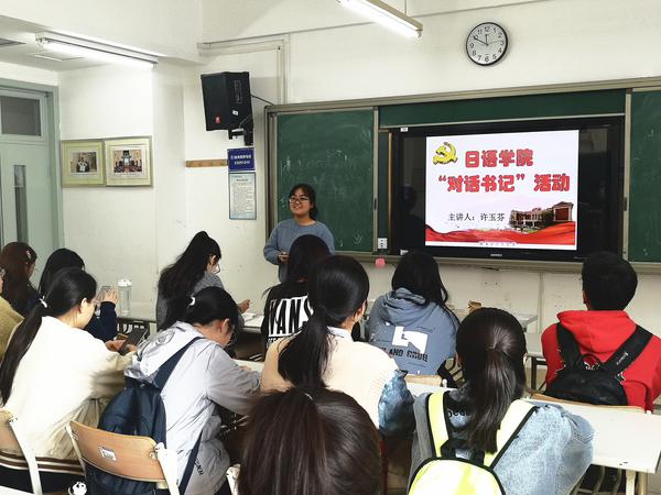 “对话”教师党支部书记沈霞:了解日语专业情况,激发新生对于专业学习和未来规划的思考,引导大家掌握正确的学习方法,为扎实的专业学习打下基础。