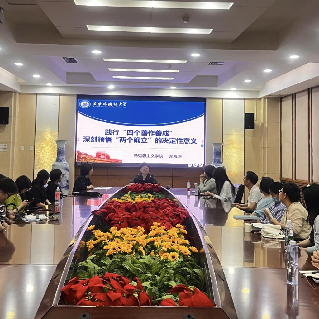 郑海呐教授以其深厚的学术背景和对党的理论的独到见解,从习近平总书记的天津之行出发,深入剖析了“两个确立”的决定性意义。她强调,深刻理解“两个确立”的重要性,不仅是对党的二十大精神的深入学习,更是坚定政治立场的根本所在。郑海呐教授的讲解涵盖了国际共产主义运动的历史经验、中国共产党的百年奋斗历程以及新时代的政治成果,为与会教师提供了丰富的历史视角和深刻的理论洞察。