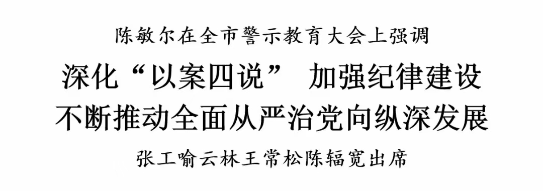 6月11日,全市警示教育大会召开。市委书记陈敏尔主持会议并讲话。他强调,要深入学习贯彻习近平总书记关于党的自我革命的重要思想和全面加强党的纪律建设的重要论述,认真贯彻落实习近平总书记视察天津重要讲话精神,充分发挥警示教育震慑作用,深化以案说德、以案说纪、以案说法、以案说责,扎实开展党纪学习教育,全面加强党的纪律建设,持续净化天津政治生态,不断推动全面从严治党向纵深发展,为奋力谱写中国式现代化天津篇章提供坚强保障。