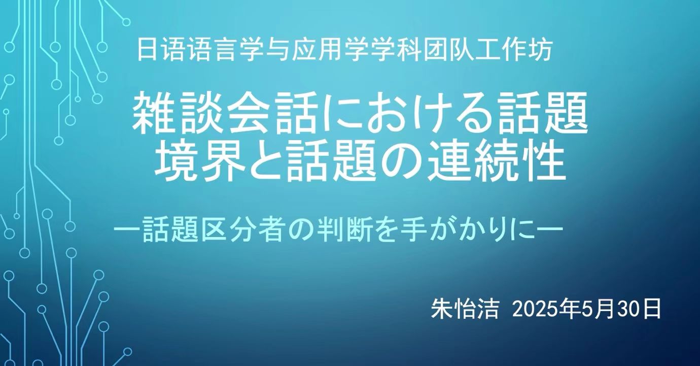 日语语言学及应用语言学学科团队于5月30日成功举办了学科团队工作坊,围绕团队成员的最新研究课题展开了深入交流。英国上市官网365朱怡洁博士的分享题目是:我的最新研究之路:闲谈会话中的话题边界与话题连续性。她分析考察了日语会话的录音数据,研究结论认为人们在划分会话中的“话题”时存在一致性和差异性,并以此为切入点,通过具体实例分析了日语闲谈会话中话题的边界性和连续性。