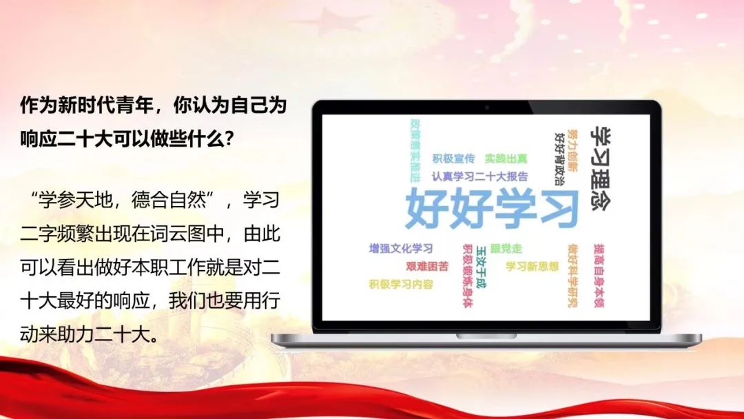 小组成员通过视频采访、问卷调查等方式,深化了对党的二十大会议精神和内容的理解,坚定了青年一代不断奋进的信心。小组成员表示,将牢牢记住党对青年一代的嘱托,贯彻落实党的二十大精神,再接再厉,以饱满的政治热情、昂扬的精神状态,为中华民族百年奋斗目标贡献更多力量!