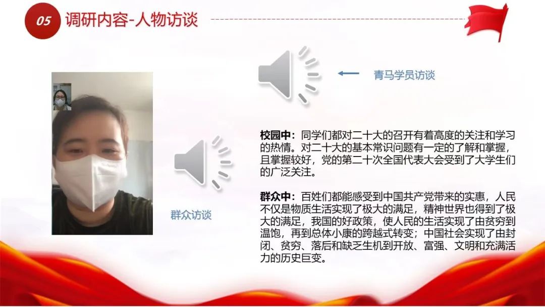 小组成员在查阅资料、问卷调查、人物访谈等过程中,不断强化对党忠诚、勇于担当的信念,大家一致表示:要在日常学习和生活中,深入了解和学习党的十八大以来党和国家事业取得的历史性成就,切实增强对党史、党的理论的学习,结合自己的专业特长加强实践,为实现中国梦的伟大事业贡献出自己的力量。